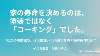 代表コラム 外壁の命、コーキングの真実 〜家を本当に守るために、私がどうしても伝えたかったこと〜 外壁のリフォームで本当に重要なのは「塗料」ではなく「コーキング」です。ただの隙間埋めと思ったら大間違いで、家を雨水から守る絶対に必要な要素となります。本記事では、札幌の過酷な気候から家を守るための「完全打ち替え」の重要性や、絶対に知っておくべき職人選びの真実をプロの視点から徹底解説します。 2026.03.05 ブログ代表コラム